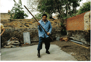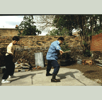 | Sijo Chee Kim Thong showing Disciple Grandmaster Yap Leong the fighting stick of Tai Cho (Emperor Fists). Chao K'uang Yin was a kung fu expert when he took over as first emperor of the Sung Dynasty (960-1279). His title as emperor was known as Tai Cho (Tai Tsu). Grandmaster Leong was appointed by Sijo Chee as the Chief Instructor for Emperor Fists in the UK. | ||